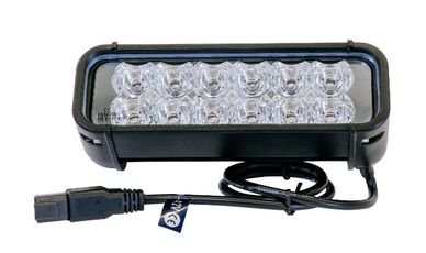 LED work lights measuring approx. 200 x 70 x 76 mm. 12 3W high-performance LEDs – arranged in two rows – operate in a robust, dust- and waterproof (IP68) aluminum housing, perfectly protected behind a scratch-resistant polycarbonate screen.
