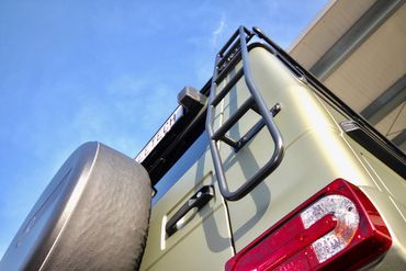 Only the G 350d Professional has threaded holes in the rear metal ex works so a ladder can be directly screwed on without additional bores. The rear ladder itself is made from quality thin-walled steel and is screwed onto the top of the roof rack and at the bottom, directly into the body. With cathodic dip coating and black powder coating, the rear ladder is perfectly protected from weather conditions and corrosion.