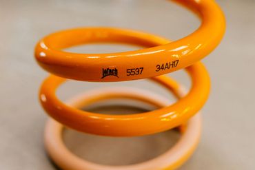 2 x rear axle coil spring, reinforced and with yellow coating, with progressive characteristic curve and winding with inconstant wire diameter.